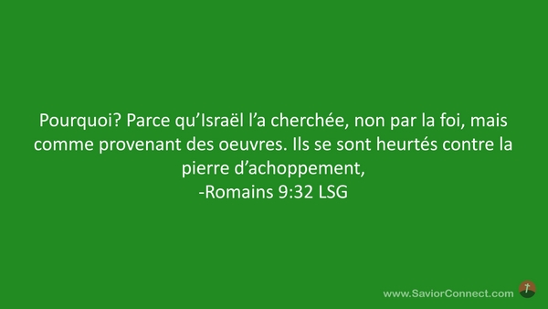 Pourquoi? Parce qu'Israël l'a cherchée, non par la foi, mais comme provenant des oeuvres. Ils se sont heurtés contre la pierre d'achoppement, -Romains 9:32 LSG
