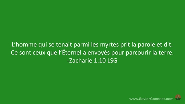 L'homme qui se tenait parmi les myrtes prit la parole et dit: Ce sont ceux que l'Éternel a envoyés pour parcourir la terre. -Zacharie 1:10 LSG