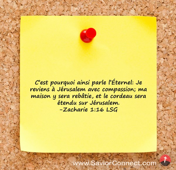 C'est pourquoi ainsi parle l'Éternel: Je reviens à Jérusalem avec compassion; ma maison y sera rebâtie, et le cordeau sera étendu sur Jérusalem. -Zacharie 1:16 LSG