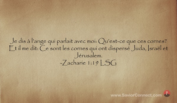 Je dis à l'ange qui parlait avec moi: Qu'est-ce que ces cornes? Et il me dit: Ce sont les cornes qui ont dispersé Juda, Israël et Jérusalem. -Zacharie 1:19 LSG