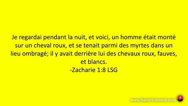 Je regardai pendant la nuit, et voici, un homme était monté sur un cheval roux, et se tenait parmi des myrtes dans un lieu ombragé; il y avait derrière lui des chevaux roux, fauves, et blancs. -Zacharie 1:8 LSG