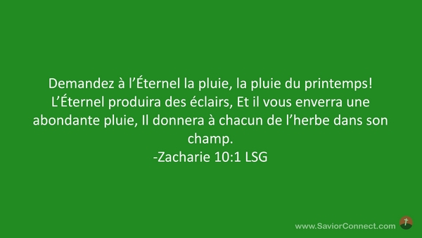 Demandez à l'Éternel la pluie, la pluie du printemps! L'Éternel produira des éclairs, Et il vous enverra une abondante pluie, Il donnera à chacun de l'herbe dans son champ. -Zacharie 10:1 LSG