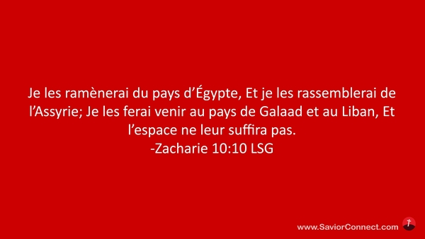 Je les ramènerai du pays d'Égypte, Et je les rassemblerai de l'Assyrie; Je les ferai venir au pays de Galaad et au Liban, Et l'espace ne leur suffira pas. -Zacharie 10:10 LSG