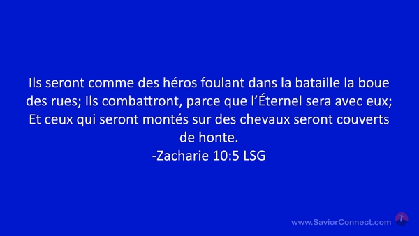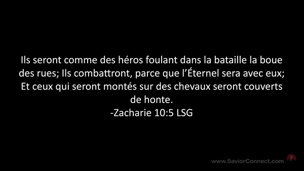 Ils seront comme des héros foulant dans la bataille la boue des rues; Ils combattront, parce que l'Éternel sera avec eux; Et ceux qui seront montés sur des chevaux seront couverts de honte. -Zacharie 10:5 LSG
