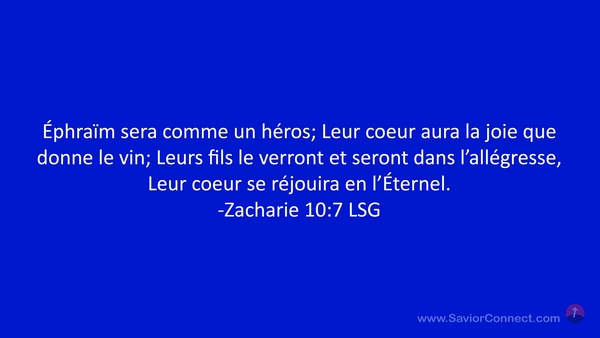 Éphraïm sera comme un héros; Leur coeur aura la joie que donne le vin; Leurs fils le verront et seront dans l'allégresse, Leur coeur se réjouira en l'Éternel. -Zacharie 10:7 LSG