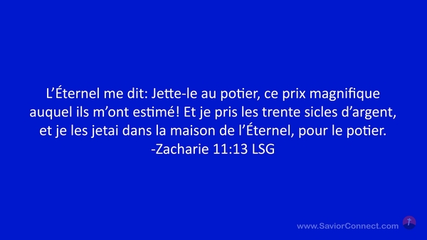 L'Éternel me dit: Jette-le au potier, ce prix magnifique auquel ils m'ont estimé! Et je pris les trente sicles d'argent, et je les jetai dans la maison de l'Éternel, pour le potier. -Zacharie 11:13 LSG