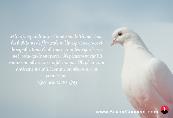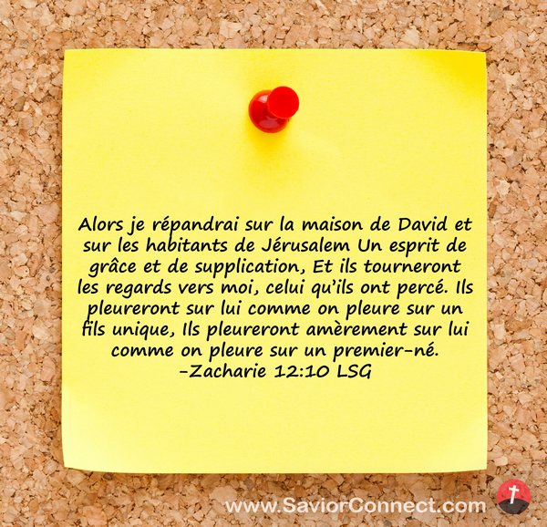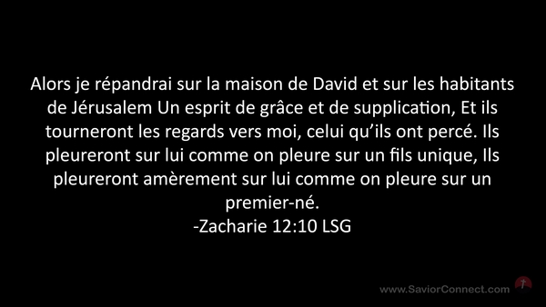 Alors je répandrai sur la maison de David et sur les habitants de Jérusalem Un esprit de grâce et de supplication, Et ils tourneront les regards vers moi, celui qu'ils ont percé. Ils pleureront sur lui comme on pleure sur un fils unique, Ils pleureront amèrement sur lui comme on pleure sur un premier-né. -Zacharie 12:10 LSG