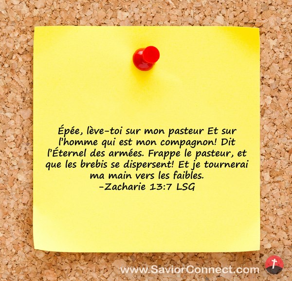 Épée, lève-toi sur mon pasteur Et sur l'homme qui est mon compagnon! Dit l'Éternel des armées. Frappe le pasteur, et que les brebis se dispersent! Et je tournerai ma main vers les faibles. -Zacharie 13:7 LSG