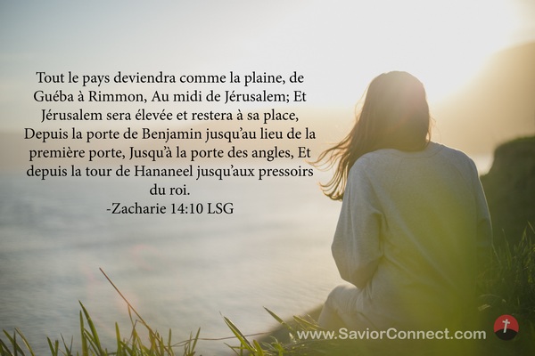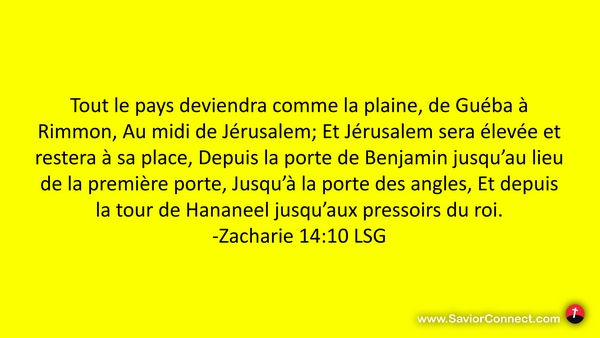 Tout le pays deviendra comme la plaine, de Guéba à Rimmon, Au midi de Jérusalem; Et Jérusalem sera élevée et restera à sa place, Depuis la porte de Benjamin jusqu'au lieu de la première porte, Jusqu'à la porte des angles, Et depuis la tour de Hananeel jusqu'aux pressoirs du roi. -Zacharie 14:10 LSG