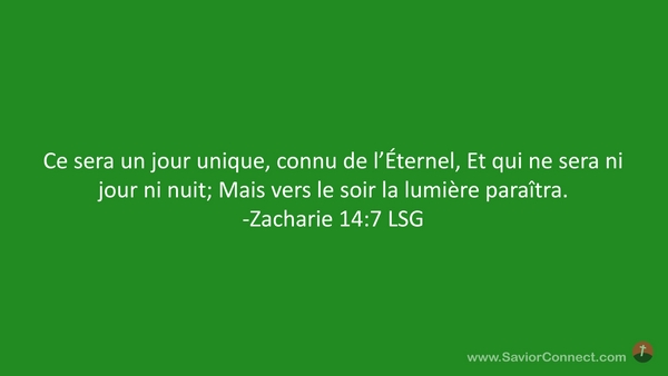 Ce sera un jour unique, connu de l'Éternel, Et qui ne sera ni jour ni nuit; Mais vers le soir la lumière paraîtra. -Zacharie 14:7 LSG
