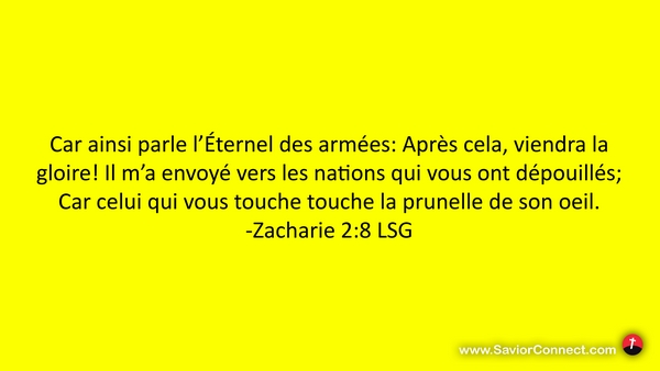 Car ainsi parle l'Éternel des armées: Après cela, viendra la gloire! Il m'a envoyé vers les nations qui vous ont dépouillés; Car celui qui vous touche touche la prunelle de son oeil. -Zacharie 2:8 LSG