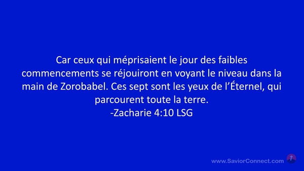 Car ceux qui méprisaient le jour des faibles commencements se réjouiront en voyant le niveau dans la main de Zorobabel. Ces sept sont les yeux de l'Éternel, qui parcourent toute la terre. -Zacharie 4:10 LSG