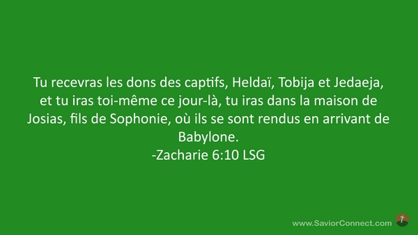 Tu recevras les dons des captifs, Heldaï, Tobija et Jedaeja, et tu iras toi-même ce jour-là, tu iras dans la maison de Josias, fils de Sophonie, où ils se sont rendus en arrivant de Babylone. -Zacharie 6:10 LSG