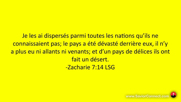 Je les ai dispersés parmi toutes les nations qu'ils ne connaissaient pas; le pays a été dévasté derrière eux, il n'y a plus eu ni allants ni venants; et d'un pays de délices ils ont fait un désert. -Zacharie 7:14 LSG