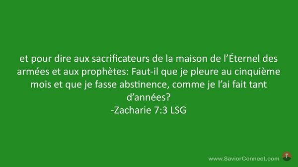 et pour dire aux sacrificateurs de la maison de l'Éternel des armées et aux prophètes: Faut-il que je pleure au cinquième mois et que je fasse abstinence, comme je l'ai fait tant d'années? -Zacharie 7:3 LSG