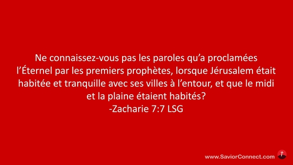 Ne connaissez-vous pas les paroles qu'a proclamées l'Éternel par les premiers prophètes, lorsque Jérusalem était habitée et tranquille avec ses villes à l'entour, et que le midi et la plaine étaient habités? -Zacharie 7:7 LSG