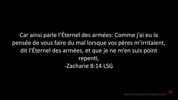 Car ainsi parle l'Éternel des armées: Comme j'ai eu la pensée de vous faire du mal lorsque vos pères m'irritaient, dit l'Éternel des armées, et que je ne m'en suis point repenti, -Zacharie 8:14 LSG