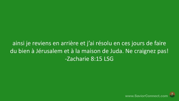 ainsi je reviens en arrière et j'ai résolu en ces jours de faire du bien à Jérusalem et à la maison de Juda. Ne craignez pas! -Zacharie 8:15 LSG
