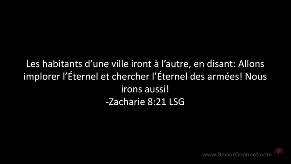 Les habitants d'une ville iront à l'autre, en disant: Allons implorer l'Éternel et chercher l'Éternel des armées! Nous irons aussi! -Zacharie 8:21 LSG