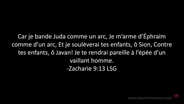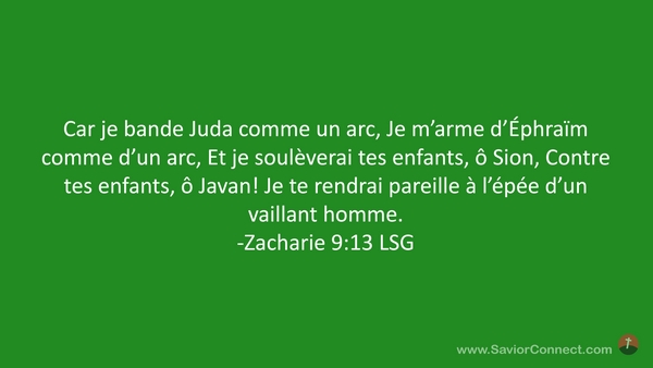 Car je bande Juda comme un arc, Je m'arme d'Éphraïm comme d'un arc, Et je soulèverai tes enfants, ô Sion, Contre tes enfants, ô Javan! Je te rendrai pareille à l'épée d'un vaillant homme. -Zacharie 9:13 LSG