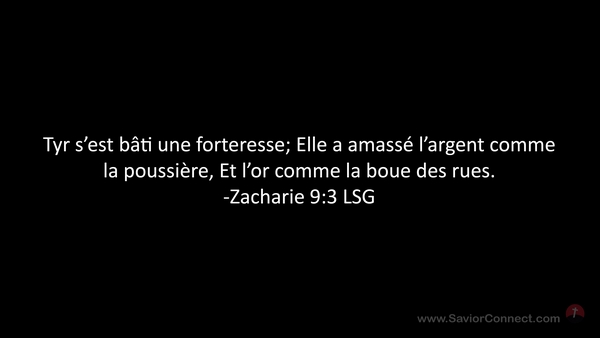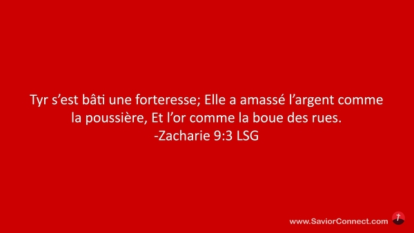 Tyr s'est bâti une forteresse; Elle a amassé l'argent comme la poussière, Et l'or comme la boue des rues. -Zacharie 9:3 LSG