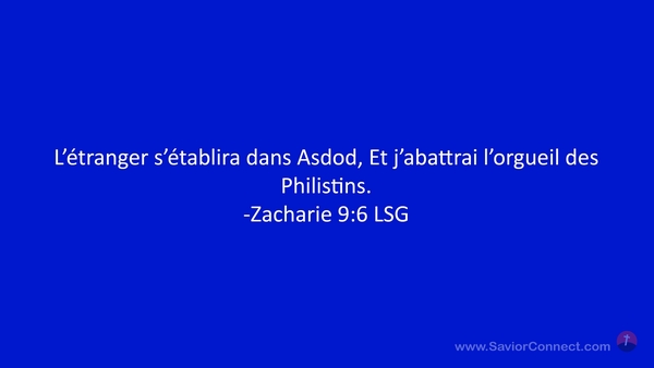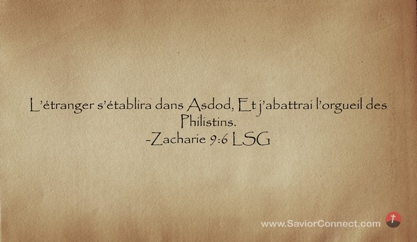 L'étranger s'établira dans Asdod, Et j'abattrai l'orgueil des Philistins. -Zacharie 9:6 LSG