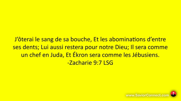 J'ôterai le sang de sa bouche, Et les abominations d'entre ses dents; Lui aussi restera pour notre Dieu; Il sera comme un chef en Juda, Et Ékron sera comme les Jébusiens. -Zacharie 9:7 LSG