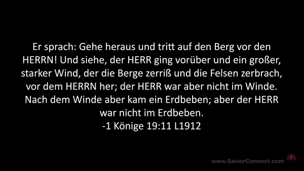 Er sprach: Gehe heraus und tritt auf den Berg vor den HERRN! Und siehe, der HERR ging vorüber und ein großer, starker Wind, der die Berge zerriß und die Felsen zerbrach, vor dem HERRN her; der HERR war aber nicht im Winde. Nach dem Winde aber kam ein Erdbeben; aber der HERR war nicht im Erdbeben. -1 Könige 19:11 L1912
