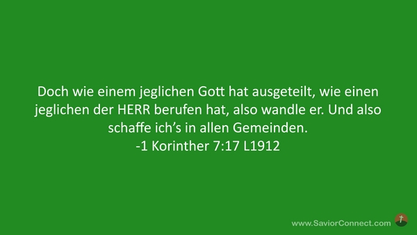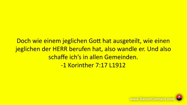 Doch wie einem jeglichen Gott hat ausgeteilt, wie einen jeglichen der HERR berufen hat, also wandle er. Und also schaffe ich's in allen Gemeinden. -1 Korinther 7:17 L1912