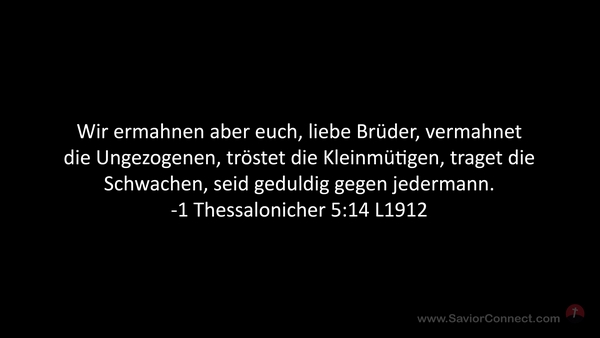 Wir ermahnen aber euch, liebe Brüder, vermahnet die Ungezogenen, tröstet die Kleinmütigen, traget die Schwachen, seid geduldig gegen jedermann. -1 Thessalonicher 5:14 L1912