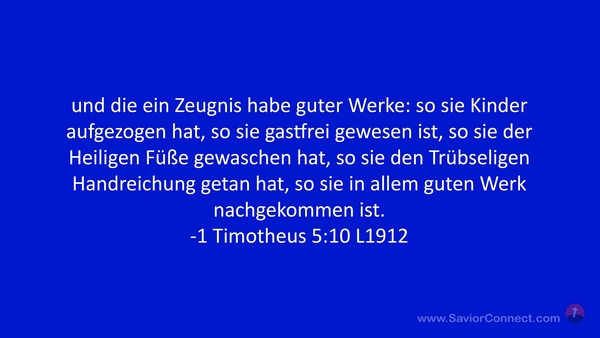 und die ein Zeugnis habe guter Werke: so sie Kinder aufgezogen hat, so sie gastfrei gewesen ist, so sie der Heiligen Füße gewaschen hat, so sie den Trübseligen Handreichung getan hat, so sie in allem guten Werk nachgekommen ist. -1 Timotheus 5:10 L1912