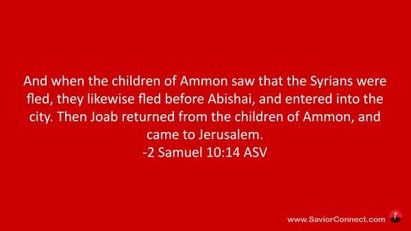 Und da die Kinder Ammon sahen, daß die Syrer flohen, flohen sie auch vor Abisai und zogen in die Stadt. Also kehrte Joab um von den Kindern Ammon und kam gen Jerusalem. -2 Samuel 10:14 L1912