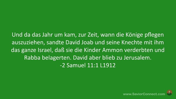 Und da das Jahr um kam, zur Zeit, wann die Könige pflegen auszuziehen, sandte David Joab und seine Knechte mit ihm das ganze Israel, daß sie die Kinder Ammon verderbten und Rabba belagerten. David aber blieb zu Jerusalem. -2 Samuel 11:1 L1912