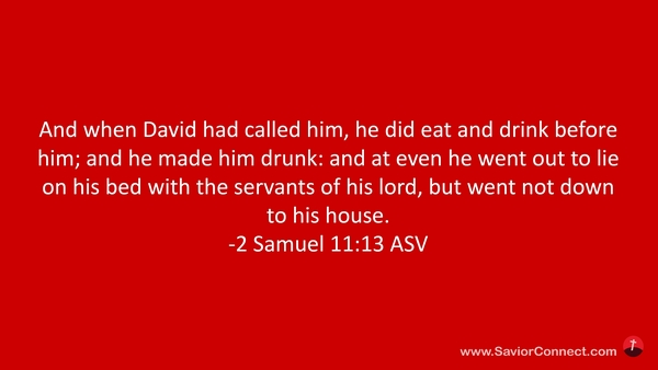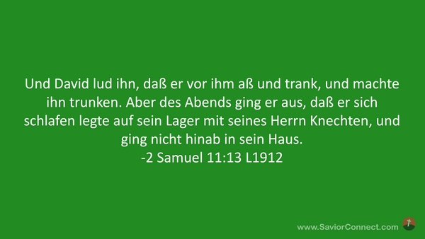Und David lud ihn, daß er vor ihm aß und trank, und machte ihn trunken. Aber des Abends ging er aus, daß er sich schlafen legte auf sein Lager mit seines Herrn Knechten, und ging nicht hinab in sein Haus. -2 Samuel 11:13 L1912