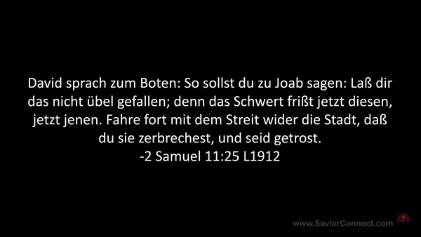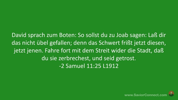 David sprach zum Boten: So sollst du zu Joab sagen: Laß dir das nicht übel gefallen; denn das Schwert frißt jetzt diesen, jetzt jenen. Fahre fort mit dem Streit wider die Stadt, daß du sie zerbrechest, und seid getrost. -2 Samuel 11:25 L1912