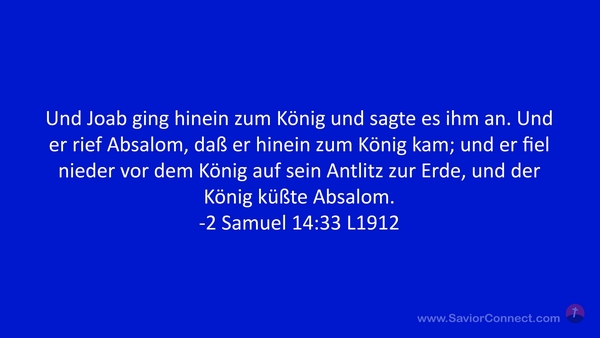 Und Joab ging hinein zum König und sagte es ihm an. Und er rief Absalom, daß er hinein zum König kam; und er fiel nieder vor dem König auf sein Antlitz zur Erde, und der König küßte Absalom. -2 Samuel 14:33 L1912