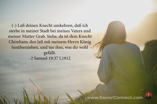 (-) Laß deinen Knecht umkehren, daß ich sterbe in meiner Stadt bei meines Vaters und meiner Mutter Grab. Siehe, da ist dein Knecht Chimham; den laß mit meinem Herrn König hinüberziehen, und tue ihm, was dir wohl gefällt. -2 Samuel 19:37 L1912