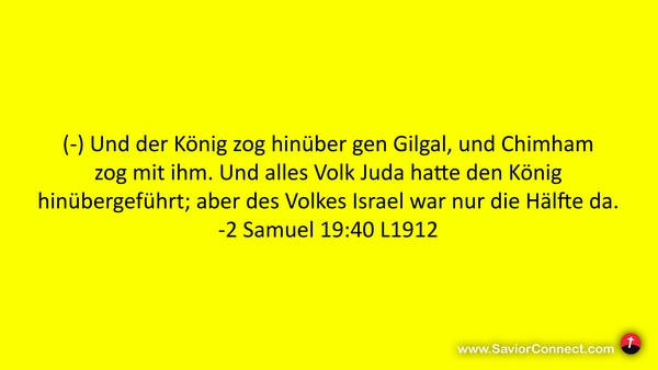 (-) Und der König zog hinüber gen Gilgal, und Chimham zog mit ihm. Und alles Volk Juda hatte den König hinübergeführt; aber des Volkes Israel war nur die Hälfte da. -2 Samuel 19:40 L1912