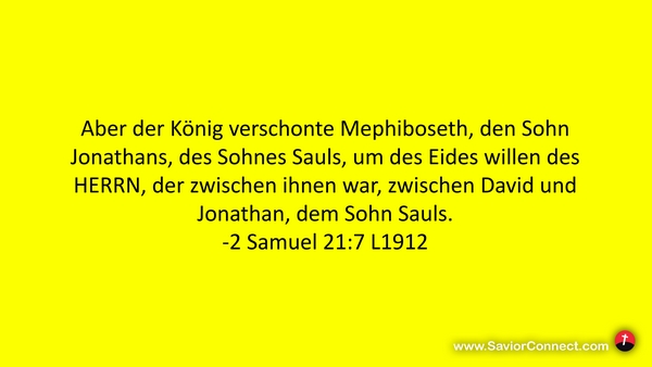 Aber der König verschonte Mephiboseth, den Sohn Jonathans, des Sohnes Sauls, um des Eides willen des HERRN, der zwischen ihnen war, zwischen David und Jonathan, dem Sohn Sauls. -2 Samuel 21:7 L1912