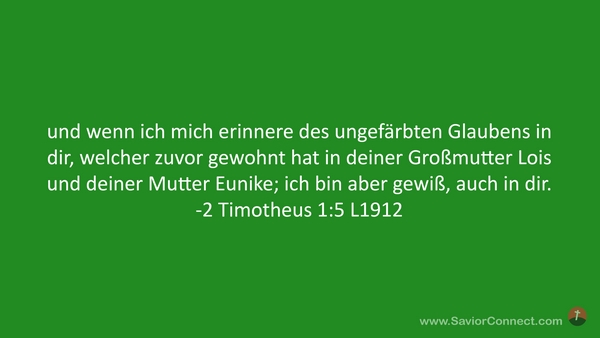 und wenn ich mich erinnere des ungefärbten Glaubens in dir, welcher zuvor gewohnt hat in deiner Großmutter Lois und deiner Mutter Eunike; ich bin aber gewiß, auch in dir. -2 Timotheus 1:5 L1912