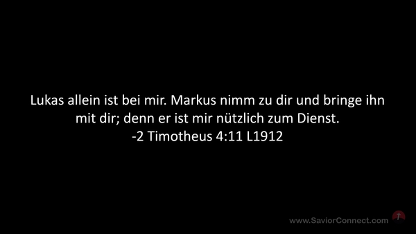 Lukas allein ist bei mir. Markus nimm zu dir und bringe ihn mit dir; denn er ist mir nützlich zum Dienst. -2 Timotheus 4:11 L1912