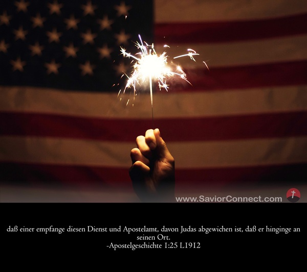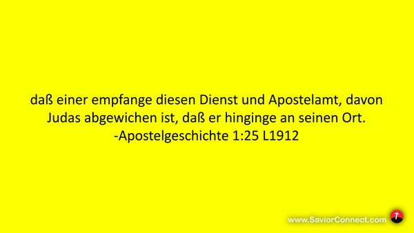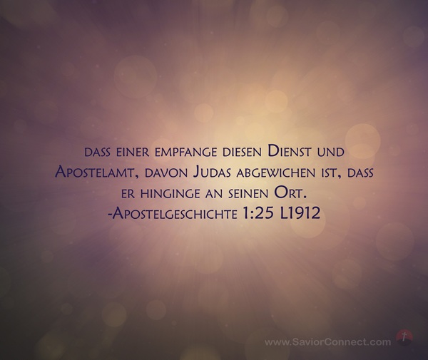 daß einer empfange diesen Dienst und Apostelamt, davon Judas abgewichen ist, daß er hinginge an seinen Ort. -Apostelgeschichte 1:25 L1912