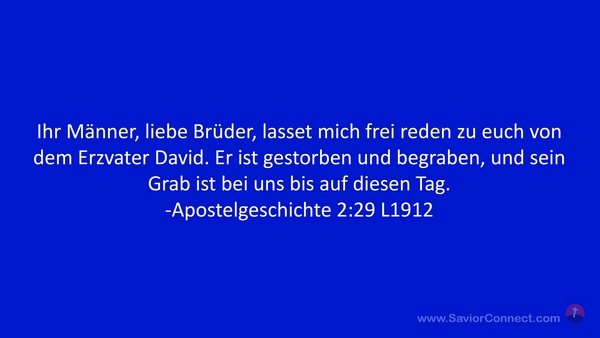 Ihr Männer, liebe Brüder, lasset mich frei reden zu euch von dem Erzvater David. Er ist gestorben und begraben, und sein Grab ist bei uns bis auf diesen Tag. -Apostelgeschichte 2:29 L1912