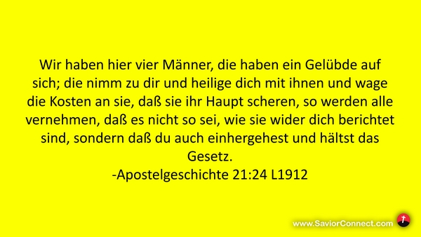 Wir haben hier vier Männer, die haben ein Gelübde auf sich; die nimm zu dir und heilige dich mit ihnen und wage die Kosten an sie, daß sie ihr Haupt scheren, so werden alle vernehmen, daß es nicht so sei, wie sie wider dich berichtet sind, sondern daß du auch einhergehest und hältst das Gesetz. -Apostelgeschichte 21:24 L1912