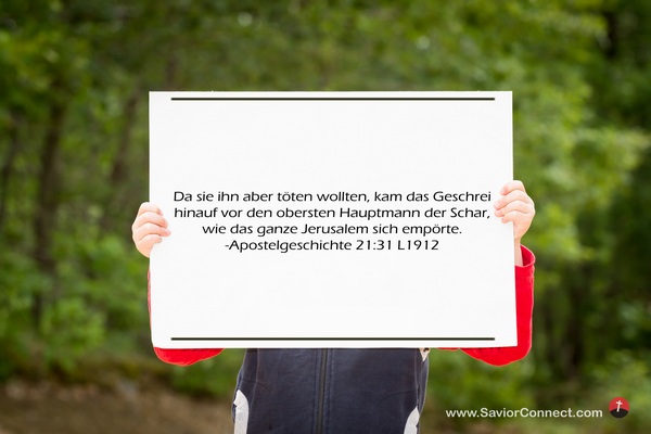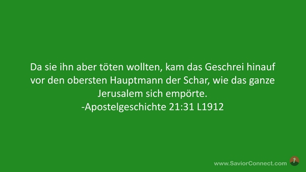 Da sie ihn aber töten wollten, kam das Geschrei hinauf vor den obersten Hauptmann der Schar, wie das ganze Jerusalem sich empörte. -Apostelgeschichte 21:31 L1912