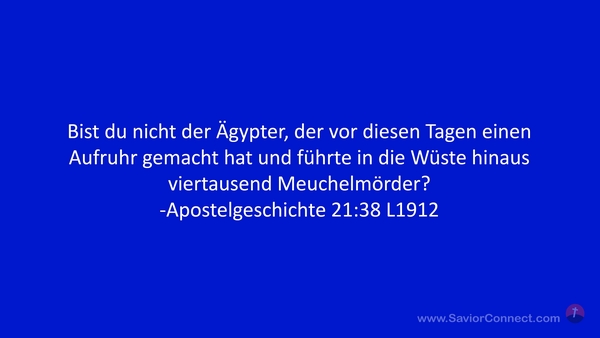 Bist du nicht der Ägypter, der vor diesen Tagen einen Aufruhr gemacht hat und führte in die Wüste hinaus viertausend Meuchelmörder? -Apostelgeschichte 21:38 L1912
