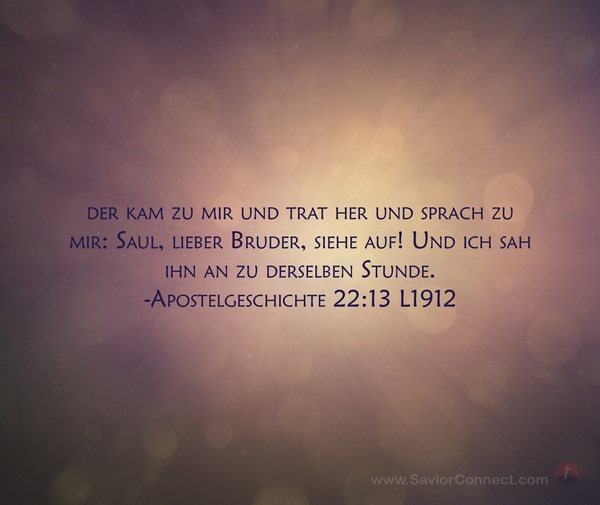 der kam zu mir und trat her und sprach zu mir: Saul, lieber Bruder, siehe auf! Und ich sah ihn an zu derselben Stunde. -Apostelgeschichte 22:13 L1912