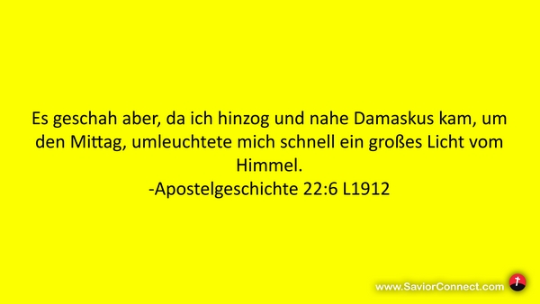 Es geschah aber, da ich hinzog und nahe Damaskus kam, um den Mittag, umleuchtete mich schnell ein großes Licht vom Himmel. -Apostelgeschichte 22:6 L1912