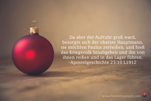 Da aber der Aufruhr groß ward, besorgte sich der oberste Hauptmann, sie möchten Paulus zerreißen, und hieß das Kriegsvolk hinabgehen und ihn von ihnen reißen und in das Lager führen. -Apostelgeschichte 23:10 L1912