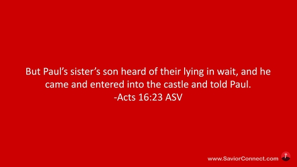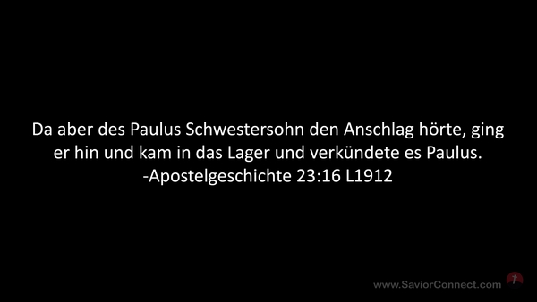 Da aber des Paulus Schwestersohn den Anschlag hörte, ging er hin und kam in das Lager und verkündete es Paulus. -Apostelgeschichte 23:16 L1912